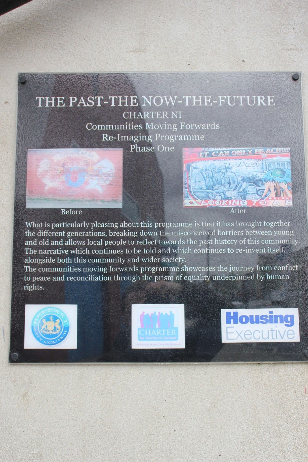 Un mural qui a été peint en deux étapes (voir lien ci-dessous). Il a été complété dans le cadre du Re-imaging communities programme qui permet de financer l'éradication d'images violentes notamment sur les murs. C'est un message de paix qui n'évoque pas de rapprochement communautaire. Le chemin est encore long.