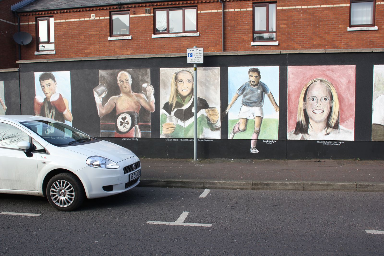 448) Sandy Row, South Belfast Publié le 10 Août 2013 A quelques mètres de celle qui précède, une très longue fresque sur la vie du quartier. . [Haut]